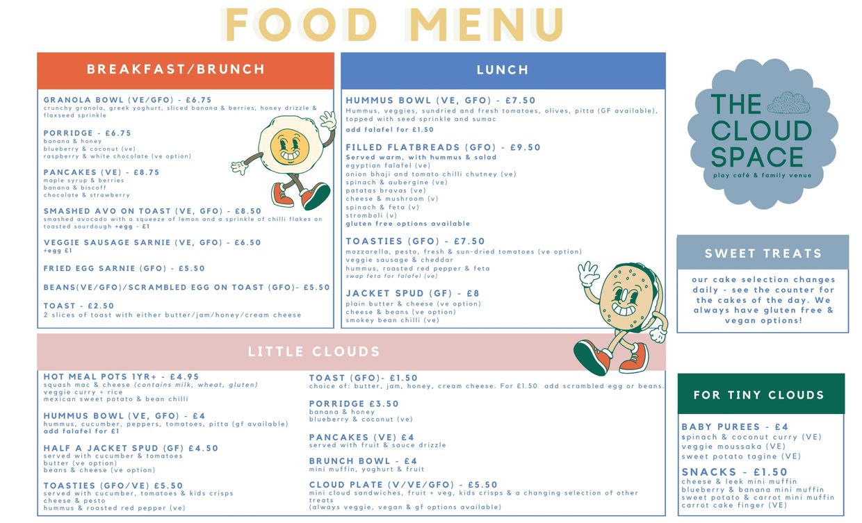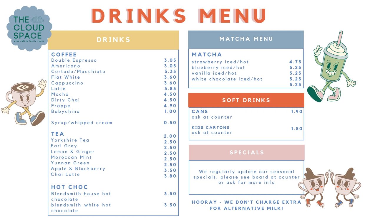 We believe that children and parents, and especially pregnant & postnatal mamas, deserve so much better than bad coffee and chicken nuggets & chips so often served at children's play spaces. Our menu is packed with a balance of fresh nutritious options, savoury & sweet treats, beautiful locally roasted coffee, high quality matcha, hot chocolate and ALWAYS yorkshire tea.